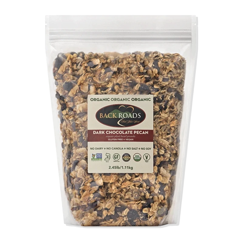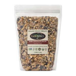 This granola contains premium Italian dark chocolate chunks (sweetened with coconut sugar), pecans, and apple juice-sweetened cranberries. 4 grams sugar and 4 grams protein per serving.