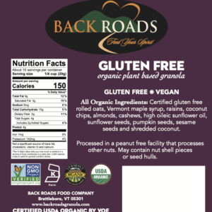 Gluten-Free Granola contains an abundance of nuts, seeds, and fruit, slow-roasted to a golden brown which enhances the flavor. Enjoy right out of the bag as a snack and as a cereal with Greek yogurt and fresh seasonal berries or fruit. 7 grams of sugar per serving and no sodium.